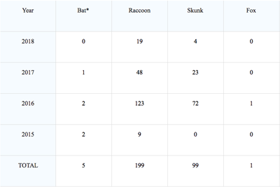 Note: A skunk was found in Lower East Hamilton was confirmed to have bat strain rabies, which is not included in the above total for Hamilton or the tables below.